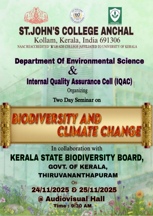 “St John's College Anchal in association with Kerala state biodiversity board is organizing two days seminar on biodiversity and climate change. Refer the attached brochure for more details